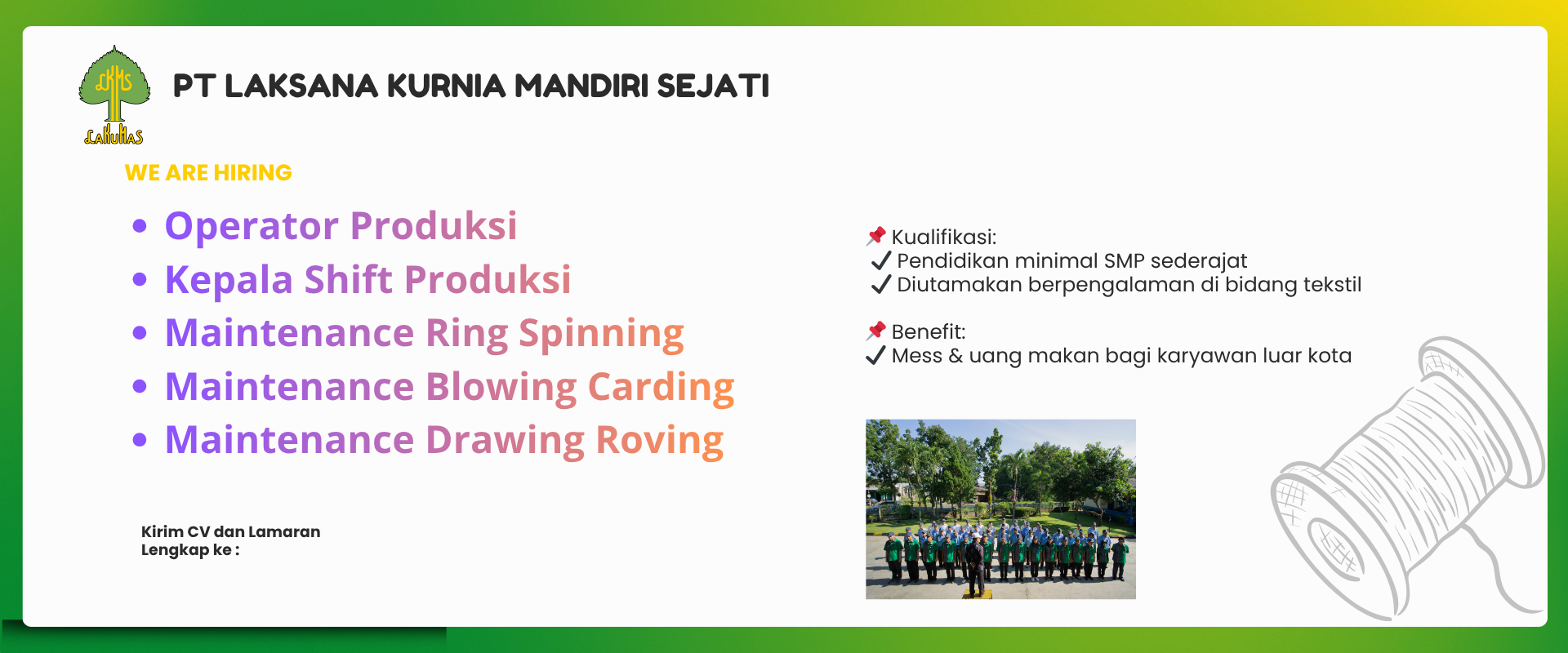 Selamat datang di halaman karir PT Laksana Kurnia Mandiri Sejati Kami percaya bahwa aset terbesar kami adalah tim kami. Kami selalu mencari individu berbakat, penuh semangat, dan berdedikasi untuk tumbuh bersama kami. Di sini, kami membangun lingkungan kerja yang kolaboratif, inovatif, dan mendukung pengembangan diri setiap individu.